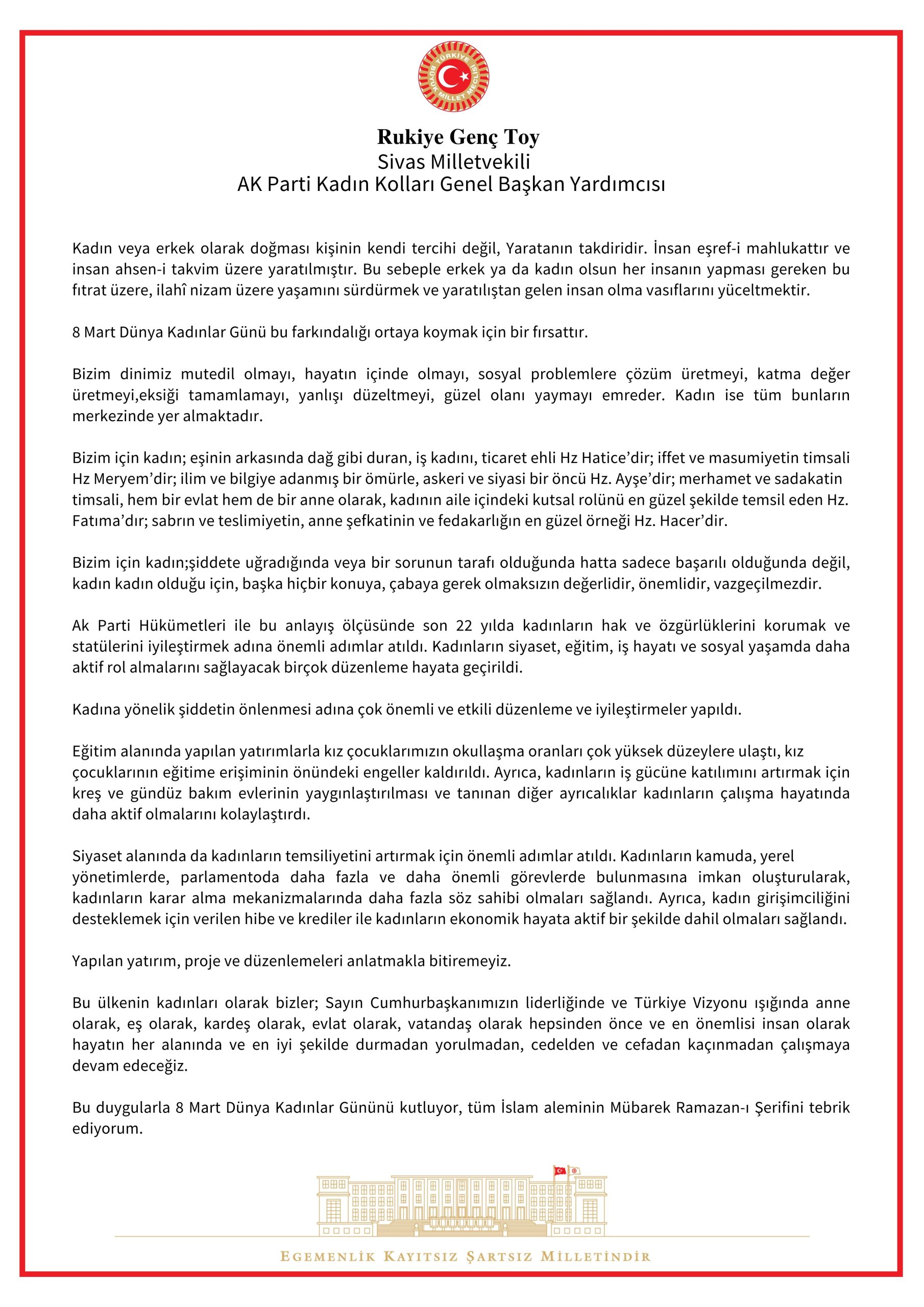 Bu duygularla 8 Mart Dünya Kadınlar Gününü kutluyor, tüm İslam aleminin Mübarek Ramazan-ı Şerifini tebrik ediyorum.