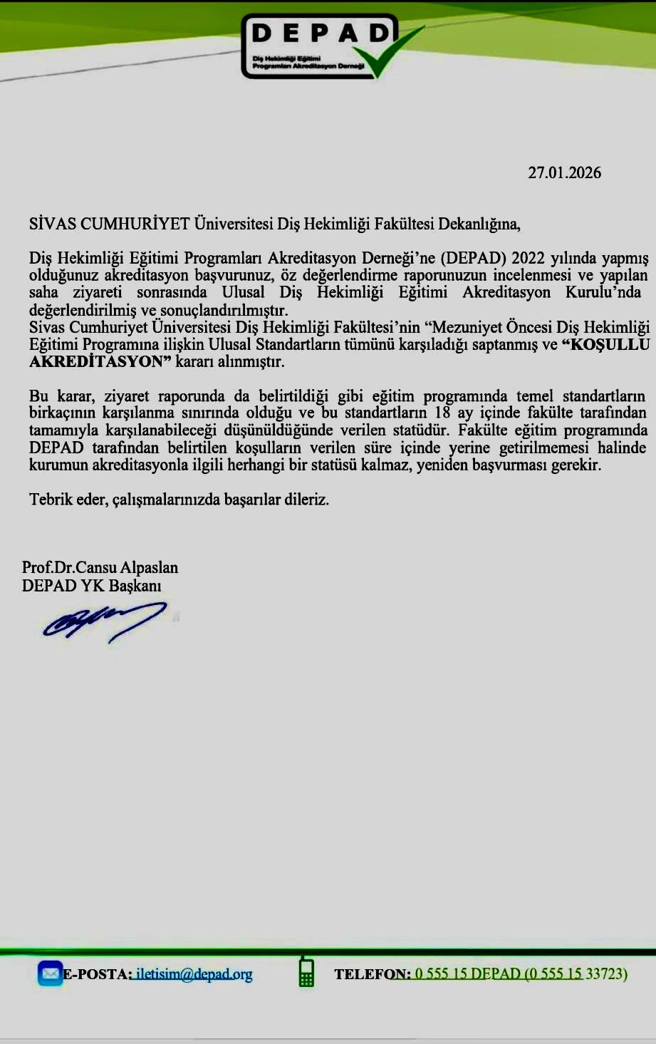 Sivas Cumhuriyet Üniversitesi Diş Hekimliği Fakültesi, Mezuniyet Öncesi Diş Hekimliği Eğitimi Programı kapsamında Diş Hekimliği Eğitimi Programları Akreditasyon Derneği (DEPAD) tarafından yürütülen değerlendirme süreci sonucunda “Koşullu Akreditasyon” almaya hak kazandı. Elde edilen bu sonuç, üniversitenin kalite odaklı yönetim anlayışı ile akademik mükemmeliyet hedeflerinin somut bir göstergesi olarak değerlendirildi.