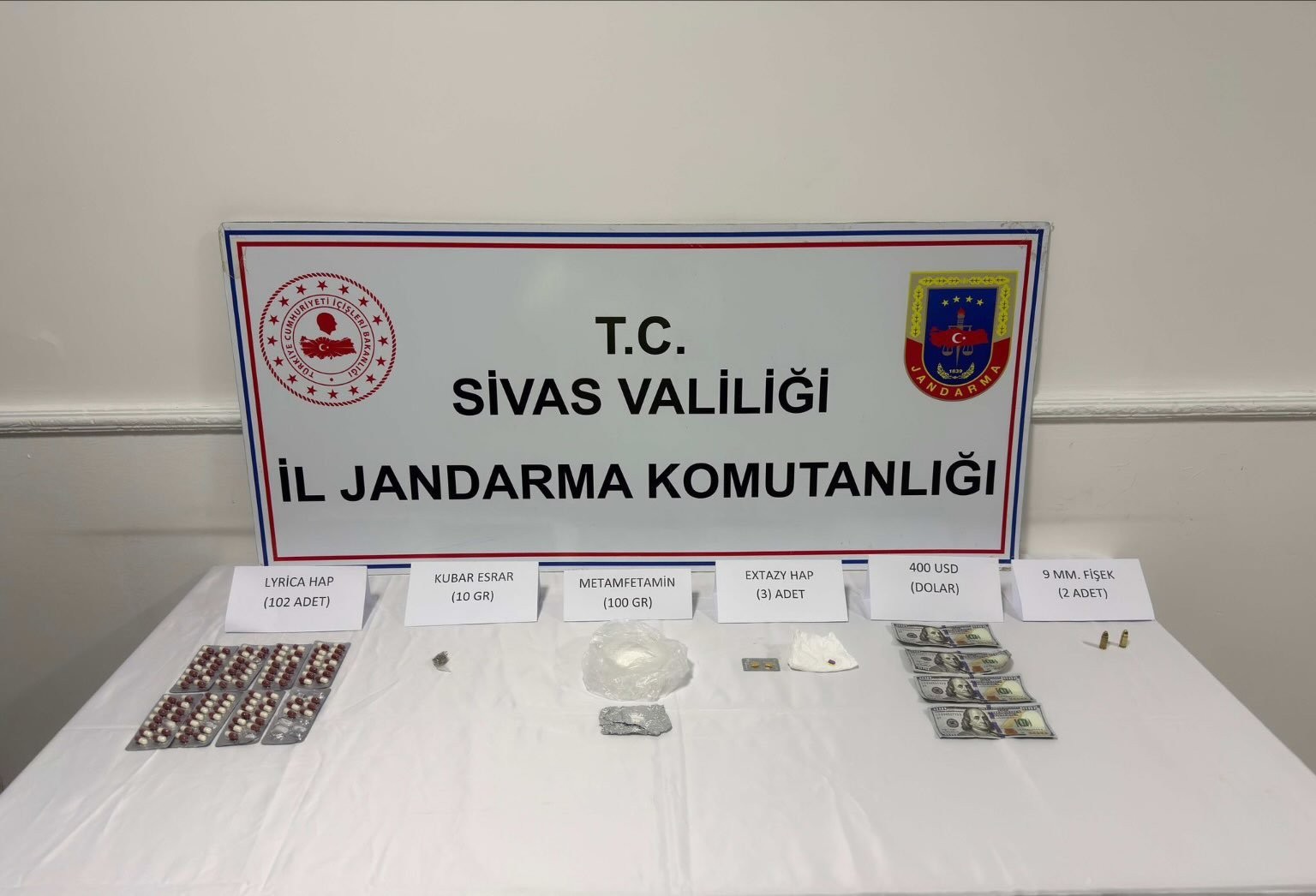 28 Ocak 2026 günü Şarkışla ilçesinde yapılan operasyonda (3) şahıs yakalanmış olup yapılan arama faaliyeti neticesinde; (100) gram metamfetamin, (10) gram esrar, (102) adet Lyrica marka sentetik ecza hap, (3) adet extacy hap ve (4) adet sahte 100 Amerikan doları ele geçirilmiştir.