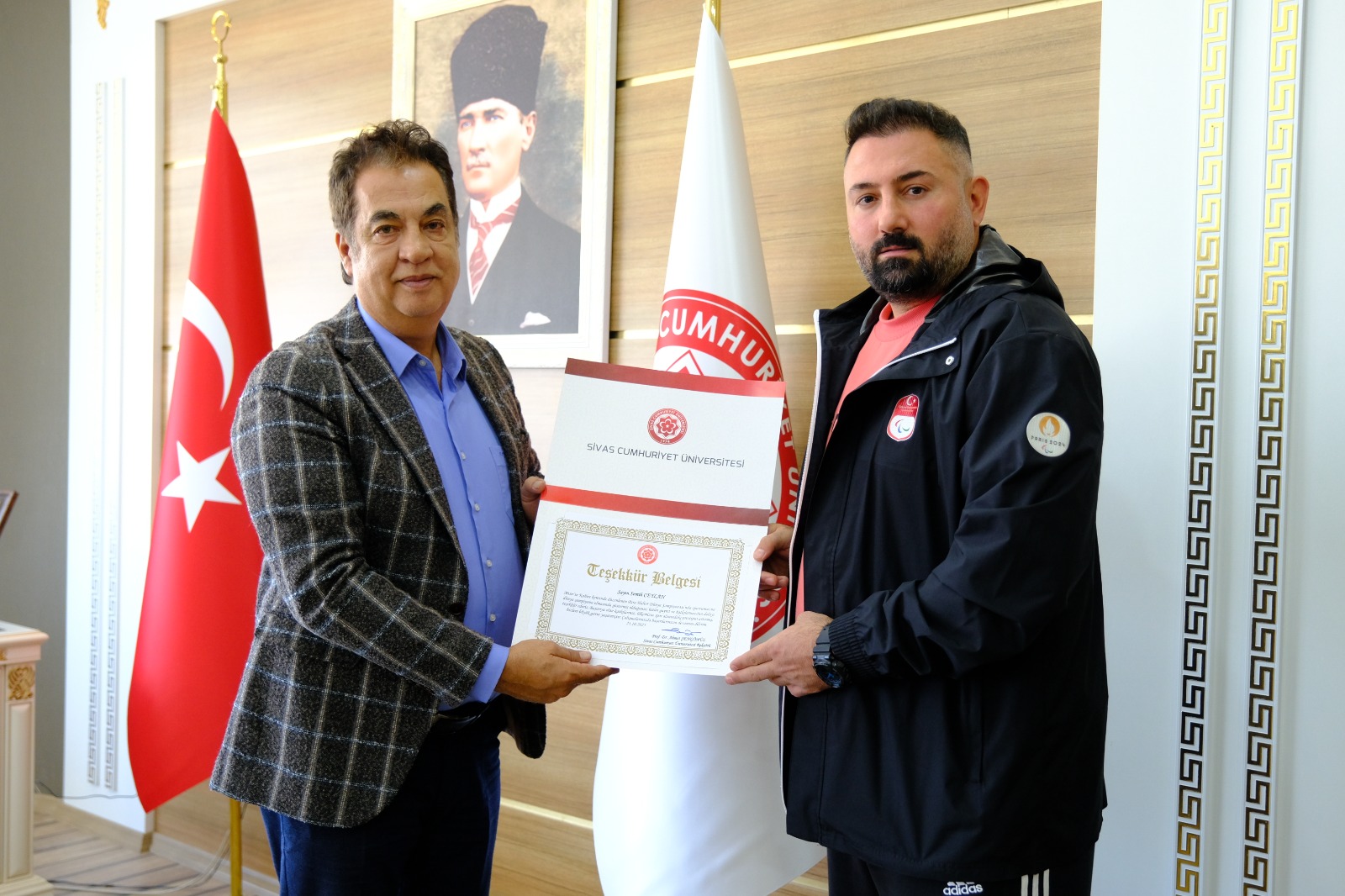 Mısır’ın başkenti Kahire’de düzenlenen Dünya Para Halter Şampiyonası’nda altın madalya kazanan öğrencimiz Abdullah Kayapınar, Cumhuriyet Üniversitesi Rektörü Prof. Dr. Ahmet Şengönül’ü makamında ziyaret etti. Erkekler 49 kilo kategorisinde yarışan milli sporcumuz, vücut ağırlığının 3,7 katı olan 179 kiloyu kaldırarak büyük bir başarıya imza attı ve dünya şampiyonu oldu. Ziyarete; Spor Bilimleri Fakültesi Dekanı Prof. Dr. İlhan Otağ, Dekan Yardımcısı Dr. Öğr. Üyesi Oğuzhan Çalı, Sivas Gençlik ve Spor İl Müdürlüğü Şube Müdürü Ufuk Demir ile Milli Takım Antrenörü Semih Ceylan da eşlik etti. Rektörümüz Prof. Dr. Ahmet Şengönül, ziyarette yaptığı konuşmada şunları söyledi: “Üniversitemizin ve ülkemizin gururu olan öğrencimiz Abdullah Kayapınar'ı tebrik ediyorum. Gösterdiği azim, disiplin ve üstün performans bizlere ilham veriyor. Sporda elde ettiği bu büyük başarı, gençlerimize örnek olacak niteliktedir. Kendisini, ailesini, antrenörlerini ve emeği geçen herkesi kutluyorum. Abdullah’ın başarılarının devamını diliyor, üniversite olarak her zaman yanında olduğumuzu ifade etmek istiyorum.” Dünya şampiyonu öğrencimiz Abdullah Kayapınar ise, desteklerinden dolayı Rektörümüz Prof. Dr. Ahmet Şengönül’e ve üniversite yönetimine teşekkür ederek yeni hedeflere odaklandığını ifade etti. Bizler de Sivas Cumhuriyet Üniversitesi olarak dünya şampiyonu öğrencimiz Abdullah Kayapınar’ı yürekten kutluyoruz. Yeni hedefi olan 18-22 Kasım tarihleri arasında Suudi Arabistan’ın başkenti Riyad’da gerçekleşecek Paralimpik Halter İslam Oyunları’nda da aynı azim ve kararlılıkla başarıya ulaşacağına yürekten inanıyoruz.