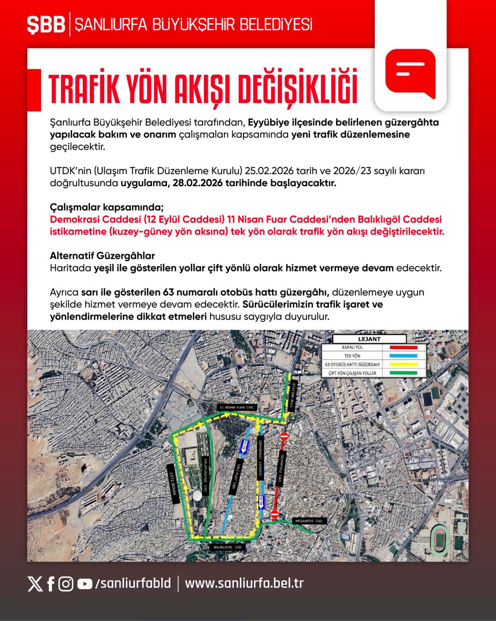 Şanlıurfa Büyükşehir Belediyesi tarafından yapılan açıklamaya göre, kent genelinde yürütülecek çalışmalar kapsamında bazı ana arterlerde trafik akışı yarından itibaren tek şerit üzerinden sağlanacak.