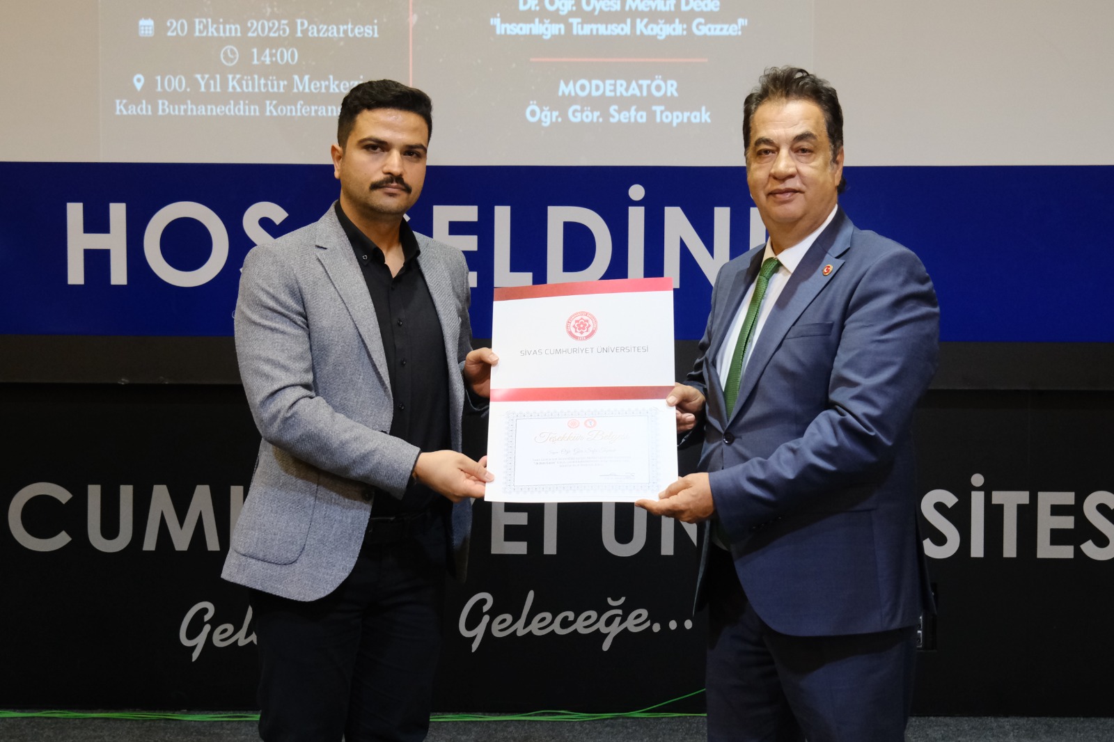 Bu anlamlı programda emeği geçen Sivas Cumhuriyet Üniversitesi Rektörlüğüne, Kariyer Merkezi ekibimize, Kurumsal İletişim Merkezine (KİMER) ve katkı sunan tüm hocalarımıza teşekkür ediyorum. Bugün burada bizlerle birlikte olan, vakit ayıran ve kalbi Gazze ile atan herkese gönülden şükranlarımı sunuyorum.”