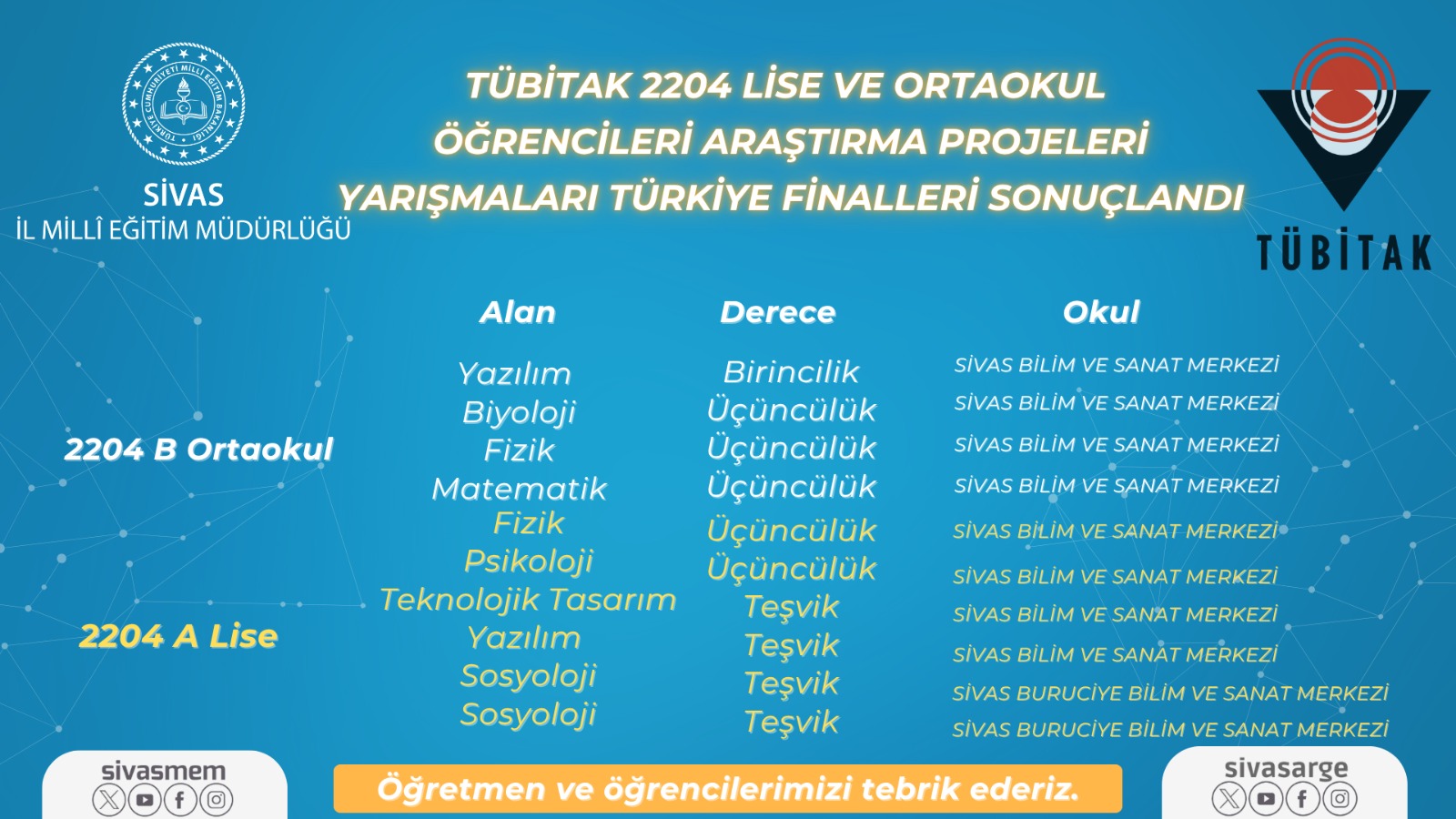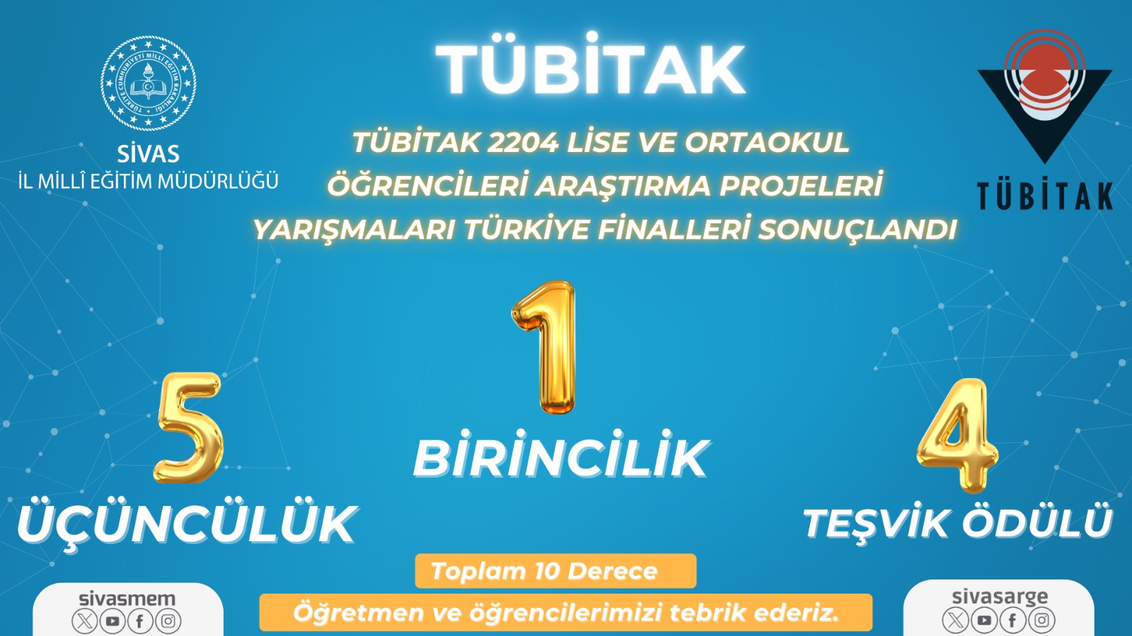 TÜBİTAK 2204 Lise ve Ortaokul Öğrencileri Araştırma Projeleri Yarışmaları Türkiye Finallerinde Sivas’tan büyük başarı. 14 Proje ile finalde yarışan öğrencilerimiz, 1 birincilik, 5 üçüncülük ve 4 teşvik ödülü kazanarak önemli bir başarı elde etti. Finalde Sivas için önemli ilkler de yaşandı. Türkiye finallerinde ilk kez birincilik başarısı elde edilirken, en fazla derece sayısına da ulaşılarak bir ilke imza atıldı. TÜBİTAK 2204-A Lise Öğrencileri Araştırma Projeleri Kayseri Bölge Finaline 35 proje ile katılan ilimiz, 16 derece elde ederek büyük bir başarıya imza atmış; bunların 8’i birincilik olmuştu. TÜBİTAK 2204-B Ortaokul Öğrencileri Araştırma Projeleri Kayseri Bölge Finaline ise 36 proje ile katılan ilimiz, 15 derece kazanmış ve 6 birincilik elde etmişti. Bölge ve Türkiye finallerine katılan ve derece elde eden öğrencilerimizi ve başarılarında emeği olan öğretmenlerimizi tebrik ediyor, başarılarının devamını diliyoruz.